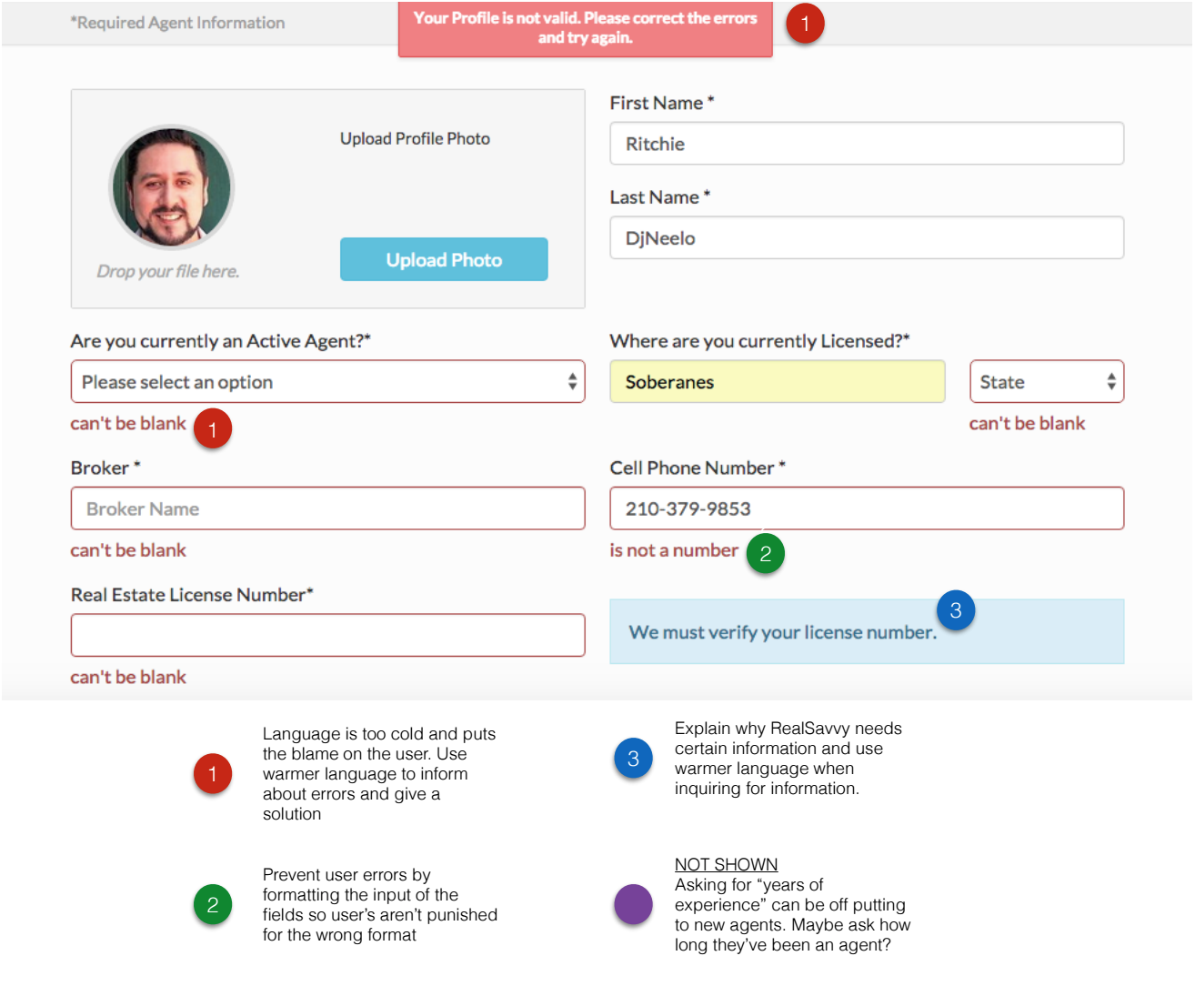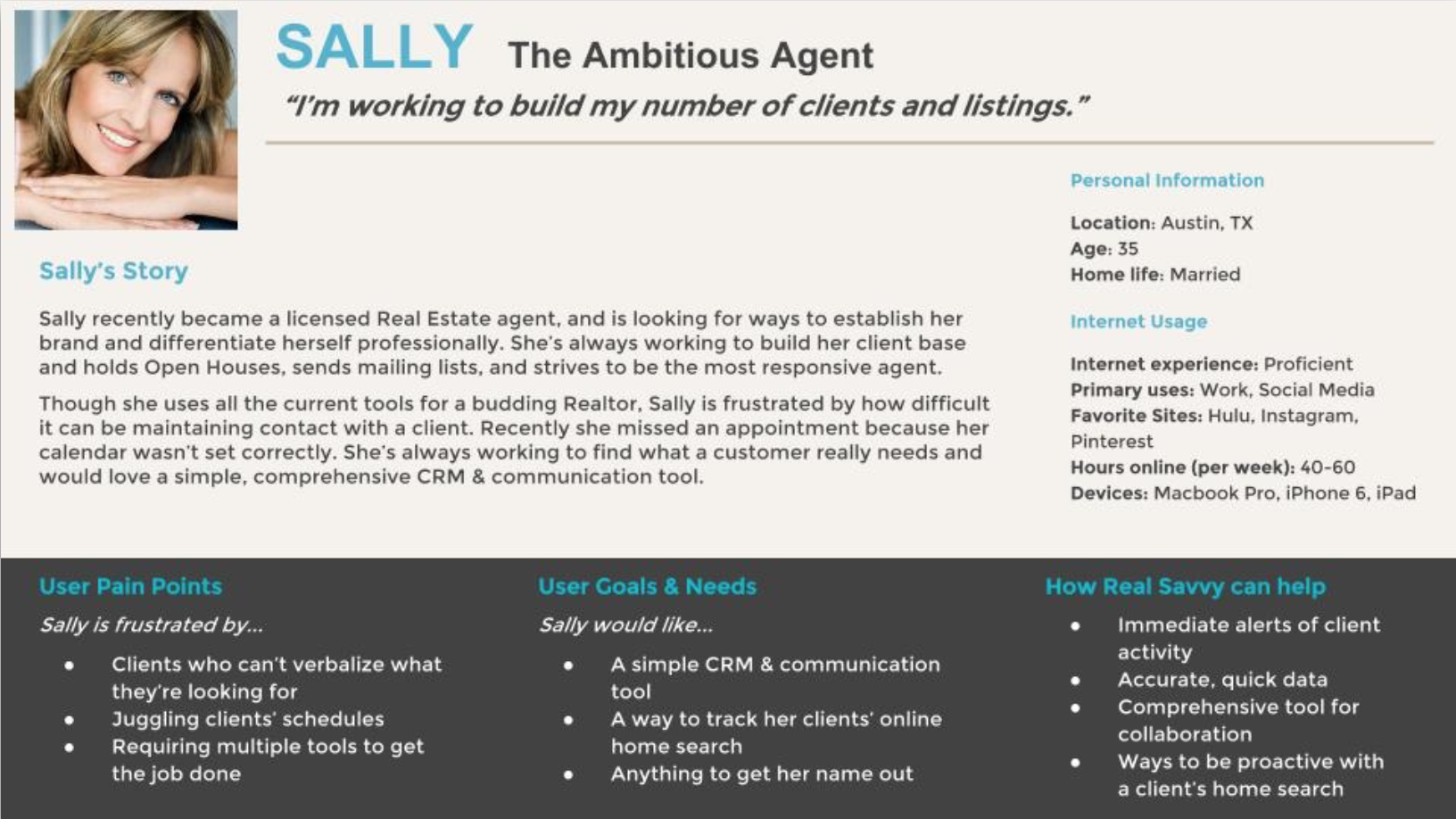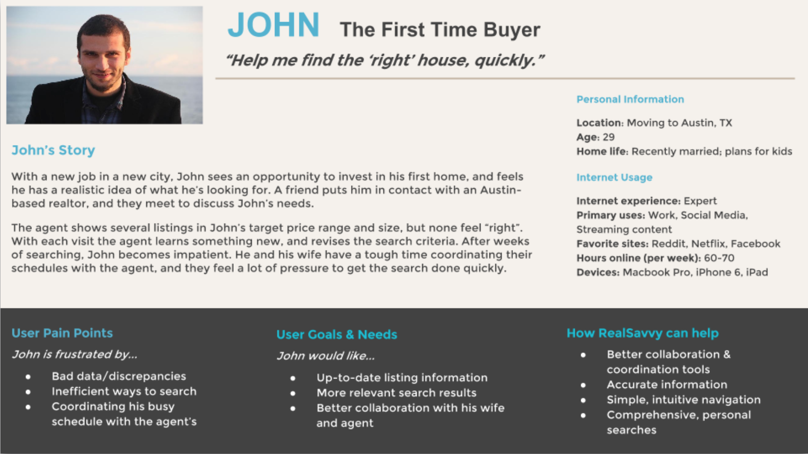 From published market research and five interviews, we learned how today’s home seekers search online, what they look for in an agent, and primary pain points in home buying process. I also ran usability tests after each interview, and found that RealSavvy’s primary offerings were poorly communicated to first-time users.